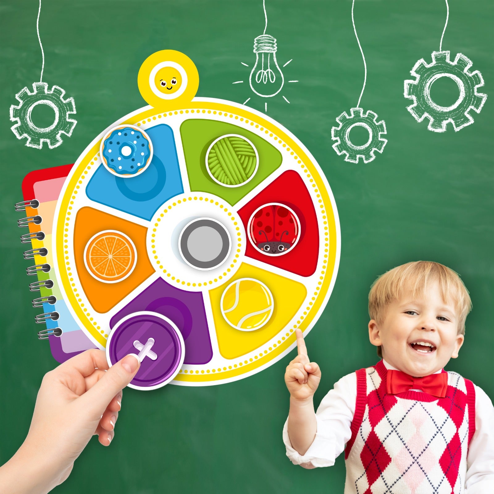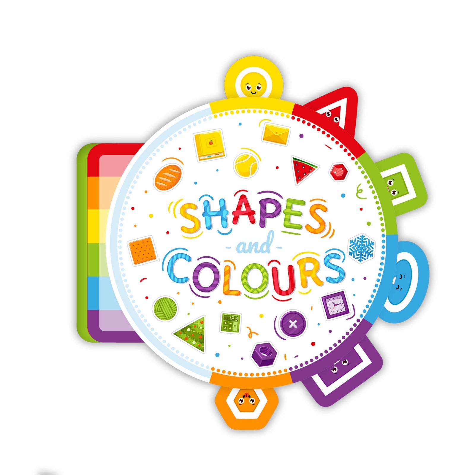 Shapes and Colours is an interactive and clever book specifically designed to teach children colours and shapes through enjoyable and engaging activities. The book features a unique circular design with bright, eye-catching colours and includes detachable pieces that help the child match the shape and colour with the appropriate picture.